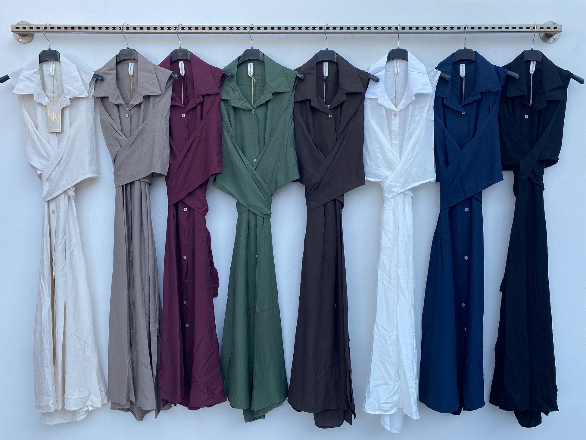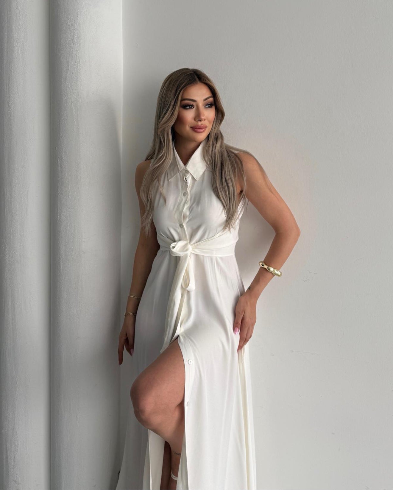 Abito CARMENSITA? fluido e leggero, senza maniche, con colletto alto e nodo sotto il seno. Gonna ampia con spacco laterale, elegante e minimal.