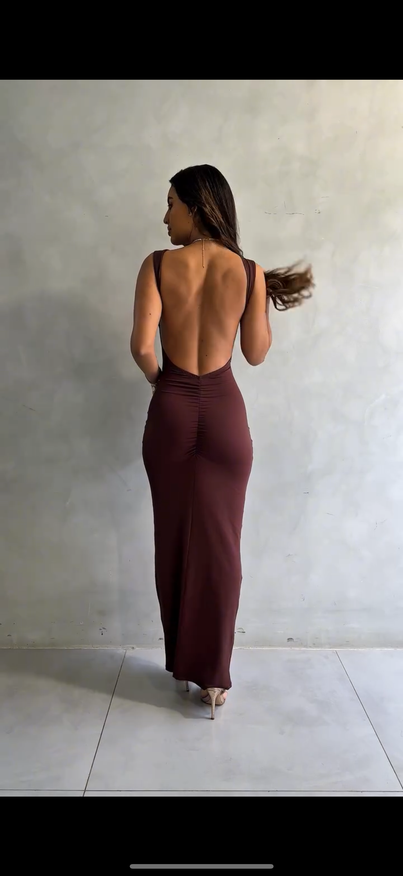 Abito: lungo fino ai piedi, aderente (stile bodycon), senza maniche e con collo alto/girocollo. Il tessuto sembra elasticizzato e morbido, di colore bordeaux scuro. Nella foto viene tirato lateralmente con le mani per mostrare quanto il materiale sia molto stretch.