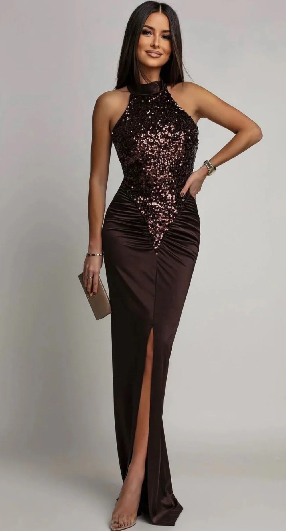 Abito Leila: eleganza sofisticata con silhouette a sirena che valorizza le forme. Il corpetto superiore è impreziosito da strass scintillanti che catturano la luce, creando un effetto luminoso affascinante. La gonna aderente segue le curve del corpo con grazia, garantendo una vestibilità impeccabile. Perfetto per occasioni speciali, cene eleganti e eventi dove desideri fare un'impressione indimenticabile. Un capo che unisce sensualità e raffinatezza in un'unica creazione.