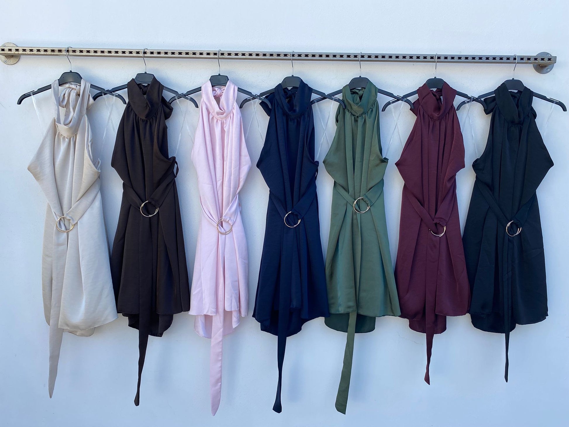 • Scollatura: alta, tipo halter, con arricciature sul davanti che aggiungono volume e delicatezza