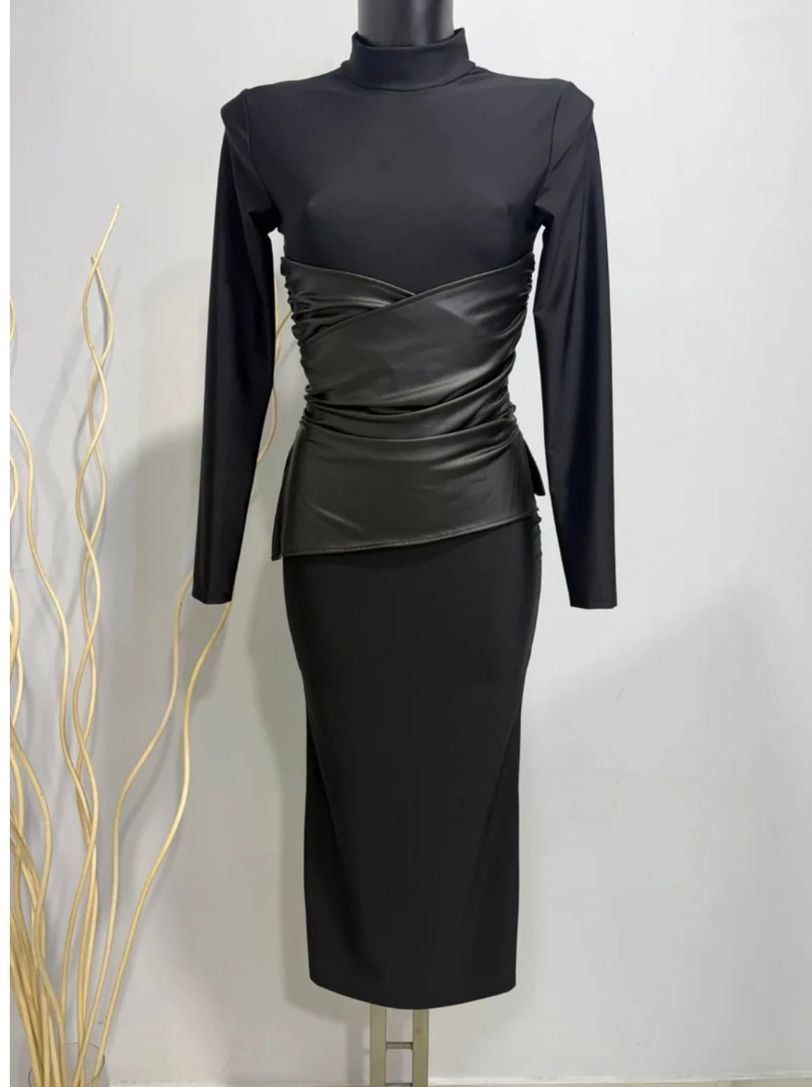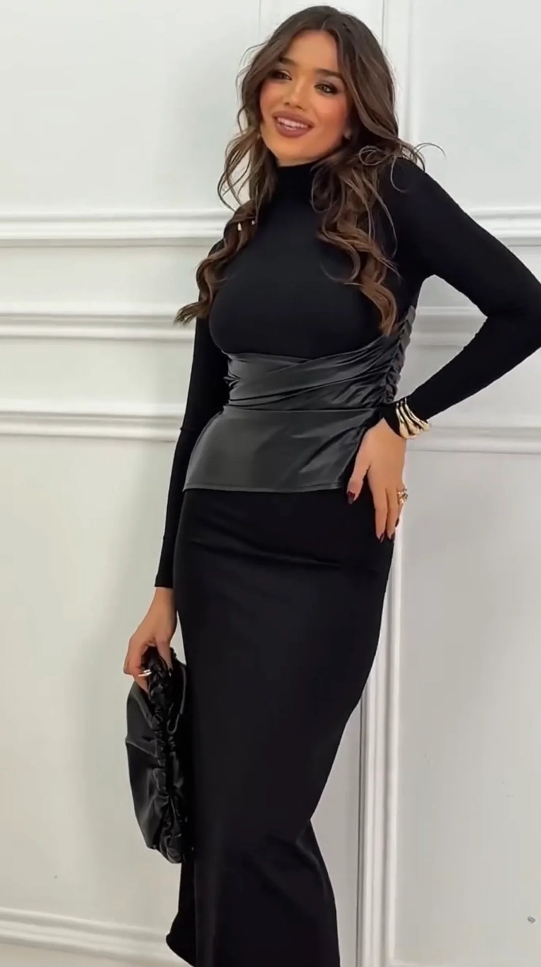 Indossa un abito lungo nero aderente, con collo alto e maniche lunghe, che crea una linea pulita e molto chic. In vita c’è un dettaglio effetto bustier/corsetto in simil-pelle nera, incrociato, che valorizza la silhouette e aggiunge un tocco moderno e sensuale.