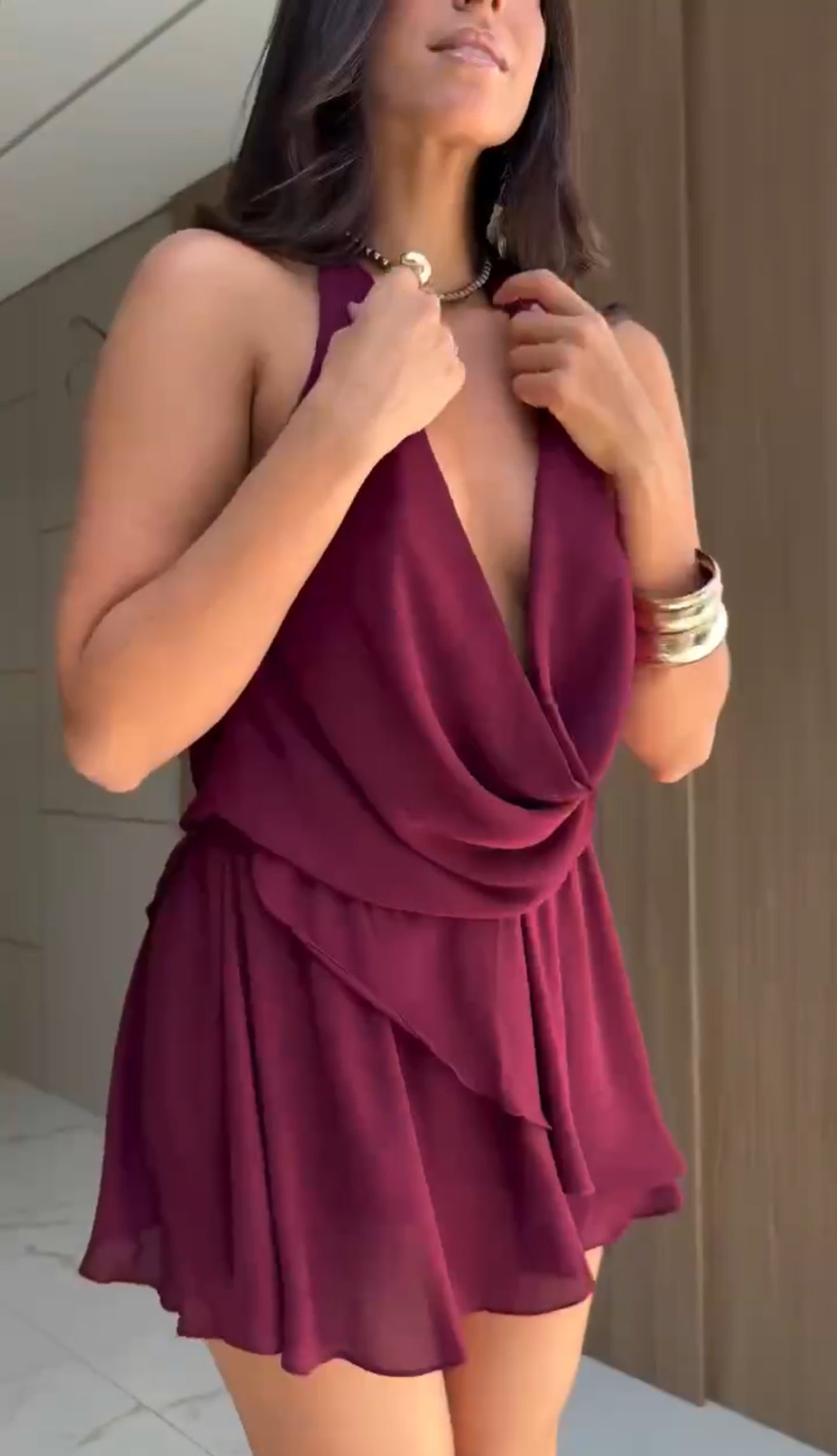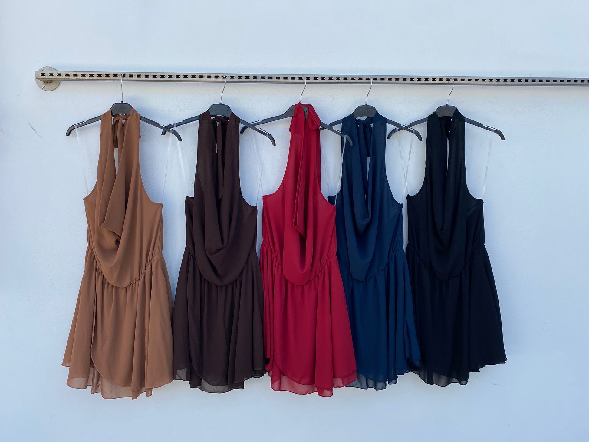 Abito corto con scollo profondo drappeggiato e allacciatura al collo. Linea aderente in vita e gonna morbida e svasata con leggero volant. Elegante e sensuale. Disponibile in diverse tonalità di colore .