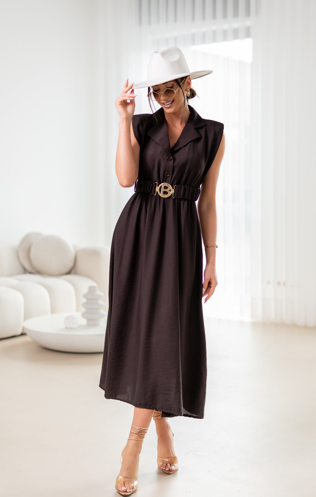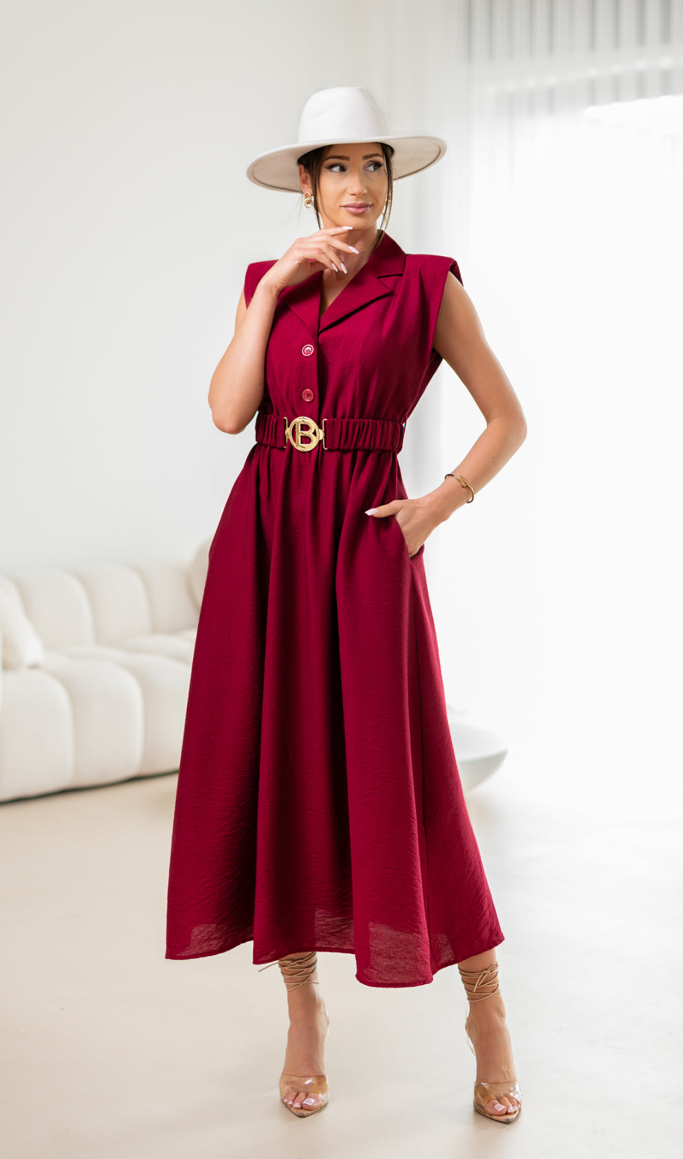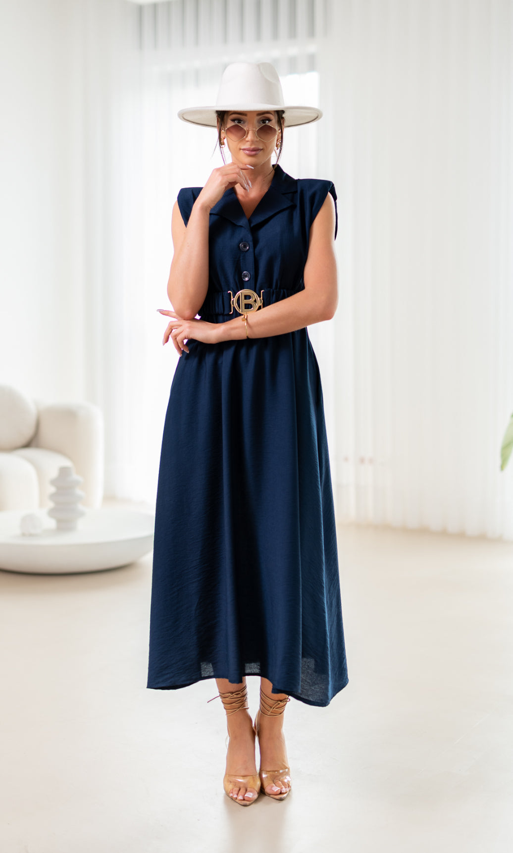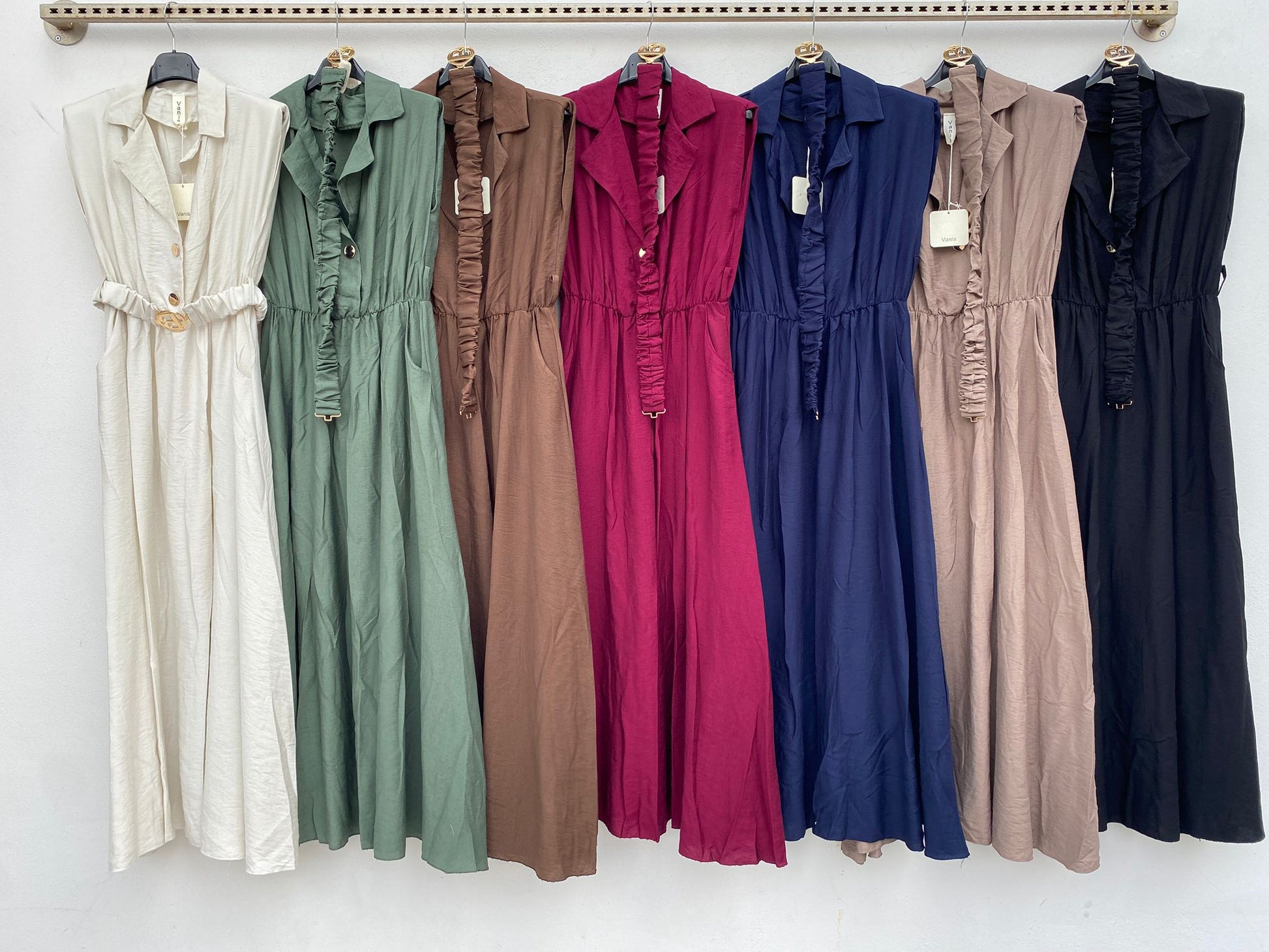 Abito OLEANDRI  dal taglio fluido, senza maniche e con colletto a revers. La vita è elasticizzata e valorizzata da una cintura coordinata con fibbia decorativa. Il tessuto leggero cade morbido fino alla caviglia, donando movimento ed eleganza.