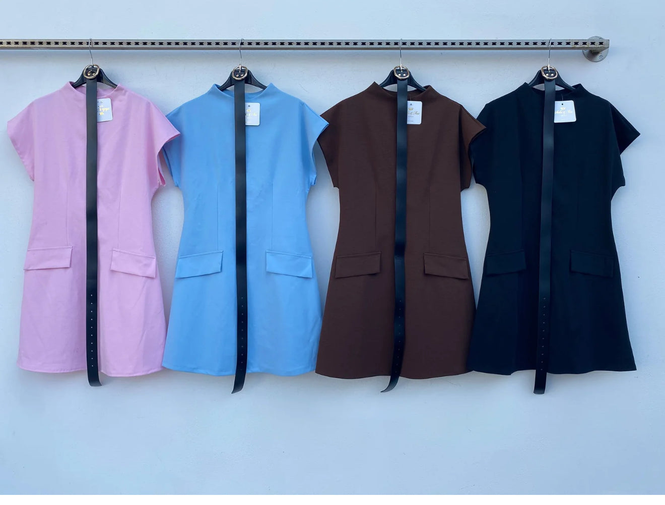 Un abito corto dal design raffinato e contemporaneo, perfetto per chi ama uno stile elegante ma essenziale. Il modello presenta un collo alto e maniche corte strutturate che donano carattere e valorizzano la silhouette. La linea leggermente svasata crea un effetto femminile e armonioso, mentre la cintura sottile in vita sottolinea le forme con discrezione.