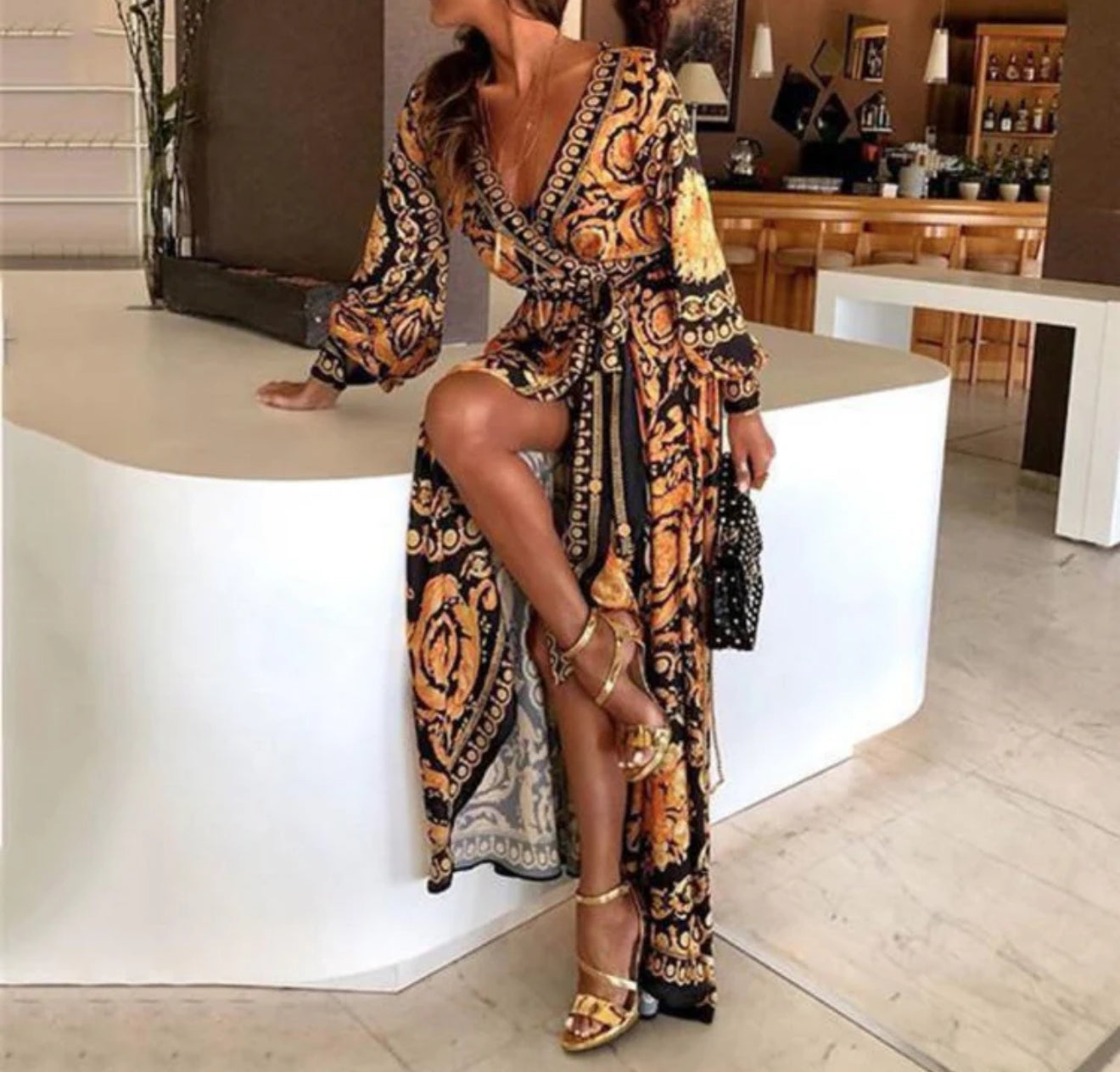 Scopri lo stile elegante e audace di ABITO VERSACE .Con chiusura a portafoglio e fantasie barocche, questo abito lungo ti farà sentire come un modello Versace. Mostra il tuo gusto per la moda e attira tutti gli sguardi con questo capo unico.