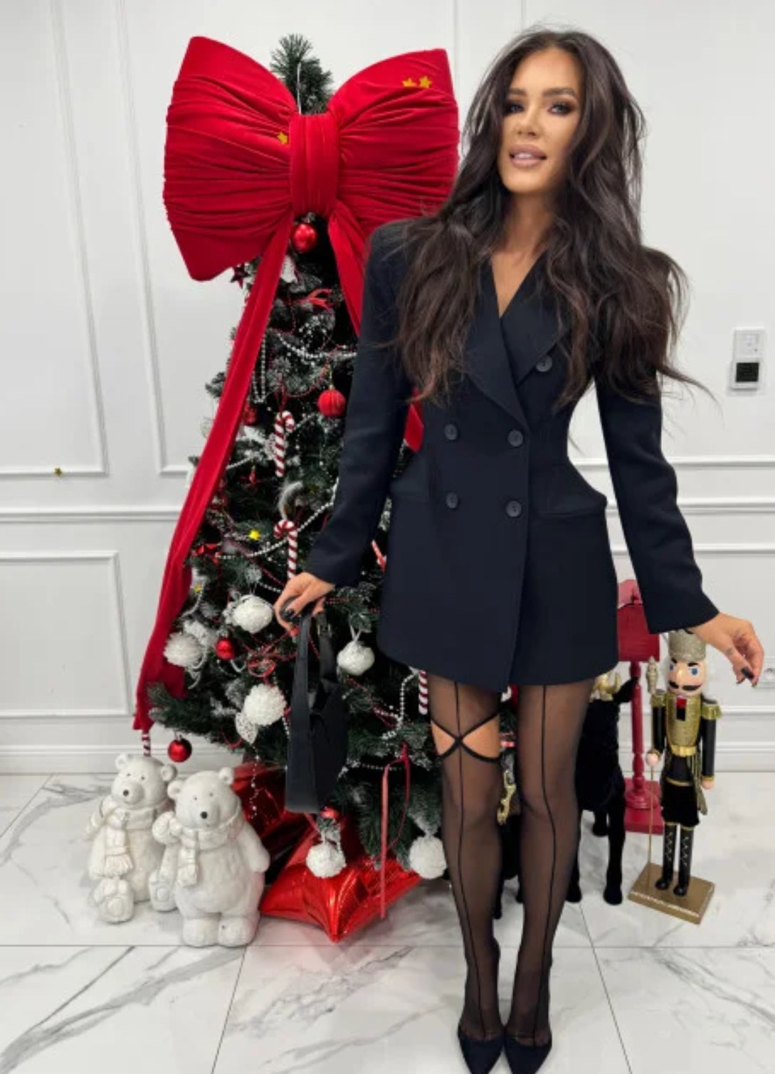 Si tratta di un blazer doppiopetto, caratterizzato da pannelli frontali sovrapposti e una chiusura con bottoni simmetrici. Ha un taglio definito e strutturato.