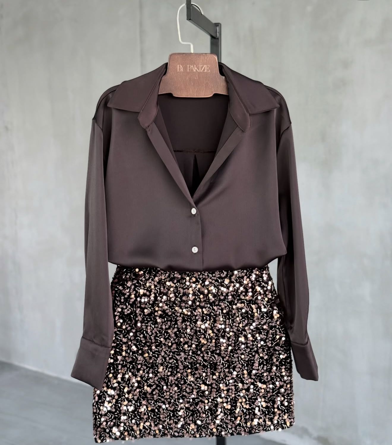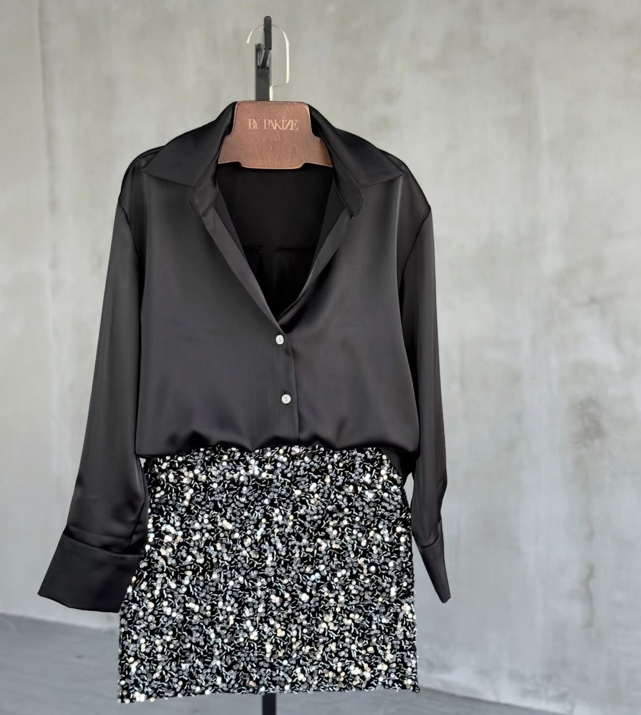 L'abbinamento di una camicia in raso nera con una gonna di paillettes nera crea un look sofisticato e d'effetto, adatto per occasioni speciali o serate.