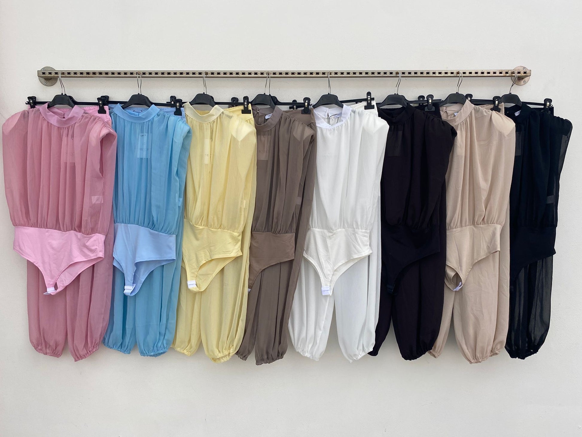 Il look è formato da un body in tessuto leggero e fluido, con collo alto morbido e delicati drappeggi frontali che donano eleganza e movimento. Le spalle leggermente strutturate e le maniche corte ampie aggiungono un tocco sofisticato. Abbinato troviamo un pantalone palazzo a vita alta, sempre nello stesso tono, con fascia in vita ampia che definisce la silhouette e slancia la figura. Il taglio è morbido e scivolato, creando un effetto molto raffinato e allungante.