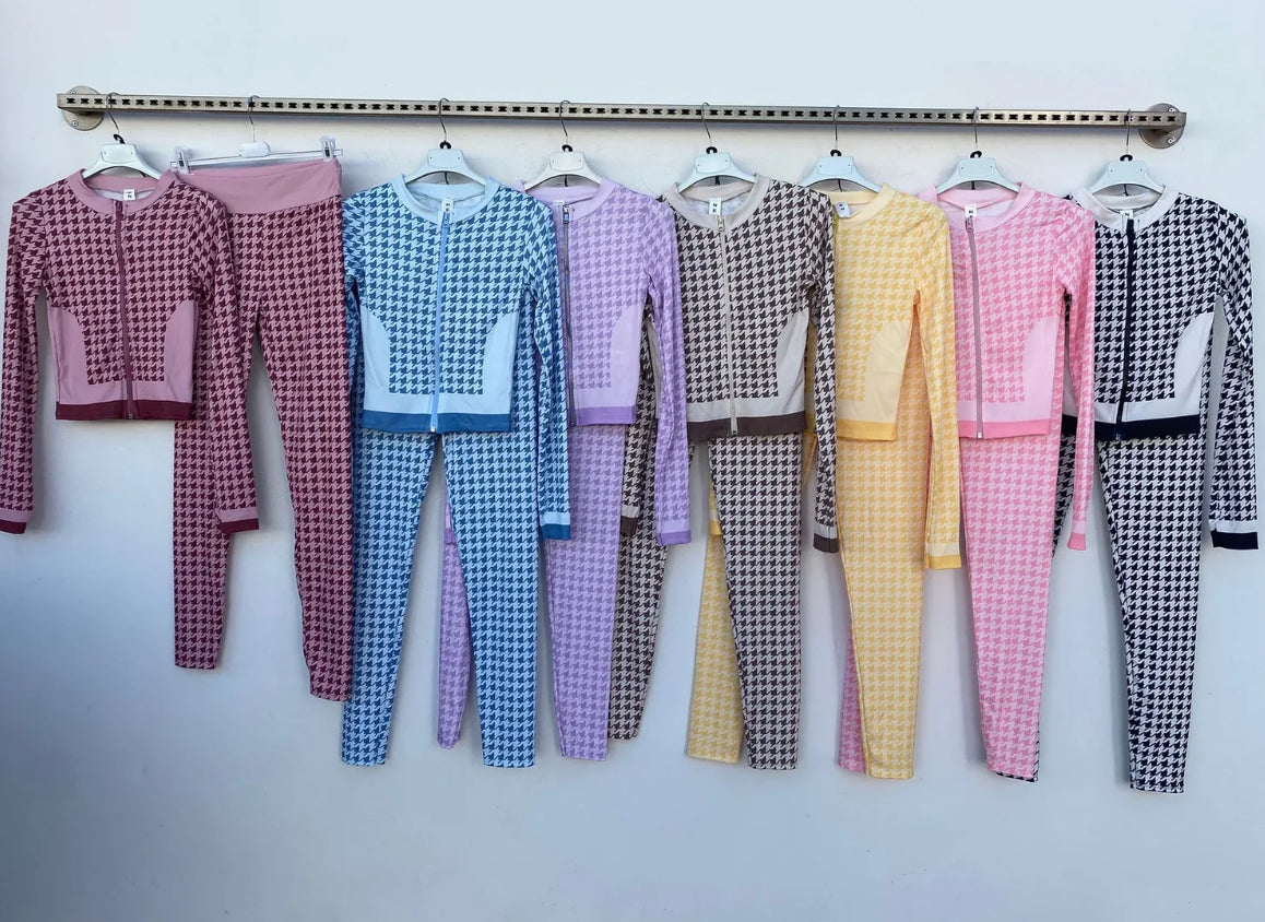 Composto da top con zip frontale a manica lunga, collo leggermente alto e vestibilità aderente che valorizza il décolleté e il punto vita. Il motivo pied-de-poule bicolore sui toni del rosa e bordeaux dona carattere e un’eleganza moderna.