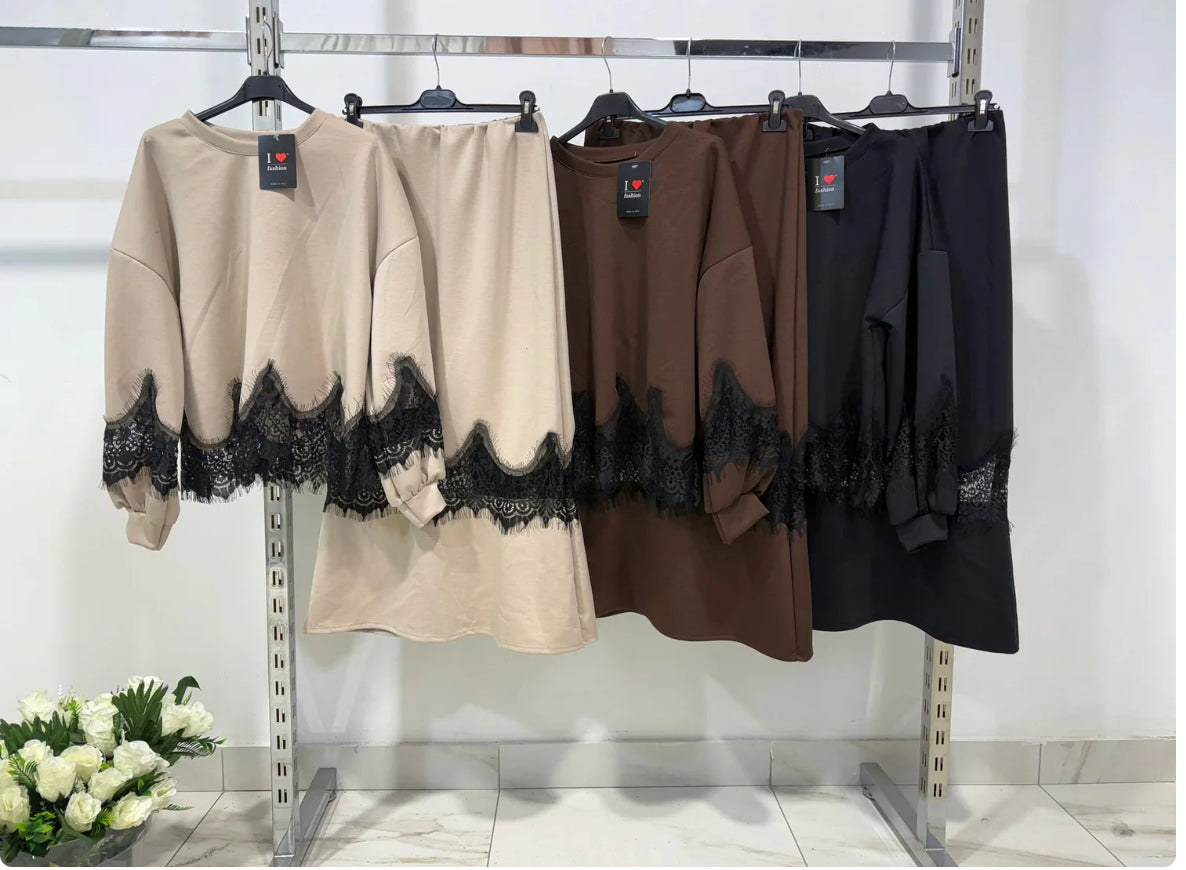 COORDINATO PAMELA un perfetto connubio di stile e comfort! Questo set composto da una gonna lunga e una felpa presenta eleganti dettagli in merletto ed è disponibile in tre varianti di colore. Scegli di esprimere la tua personalità con un look che unisce raffinatezza e praticità!