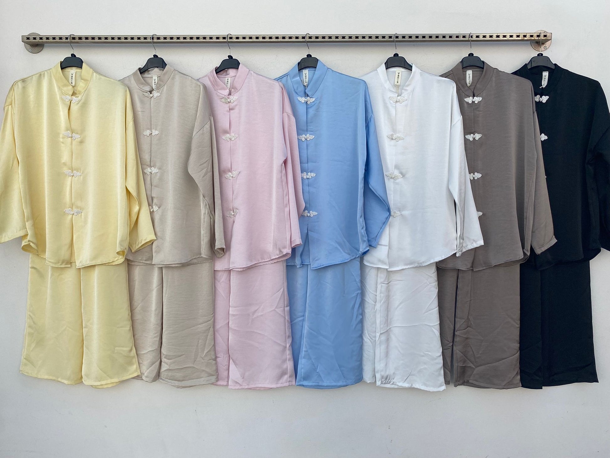 • La parte sopra è una giacca strutturata con colletto alto e chiusura con bottoni decorativi stile orientale (frog buttons), che aggiungono un dettaglio elegante e distintivo.