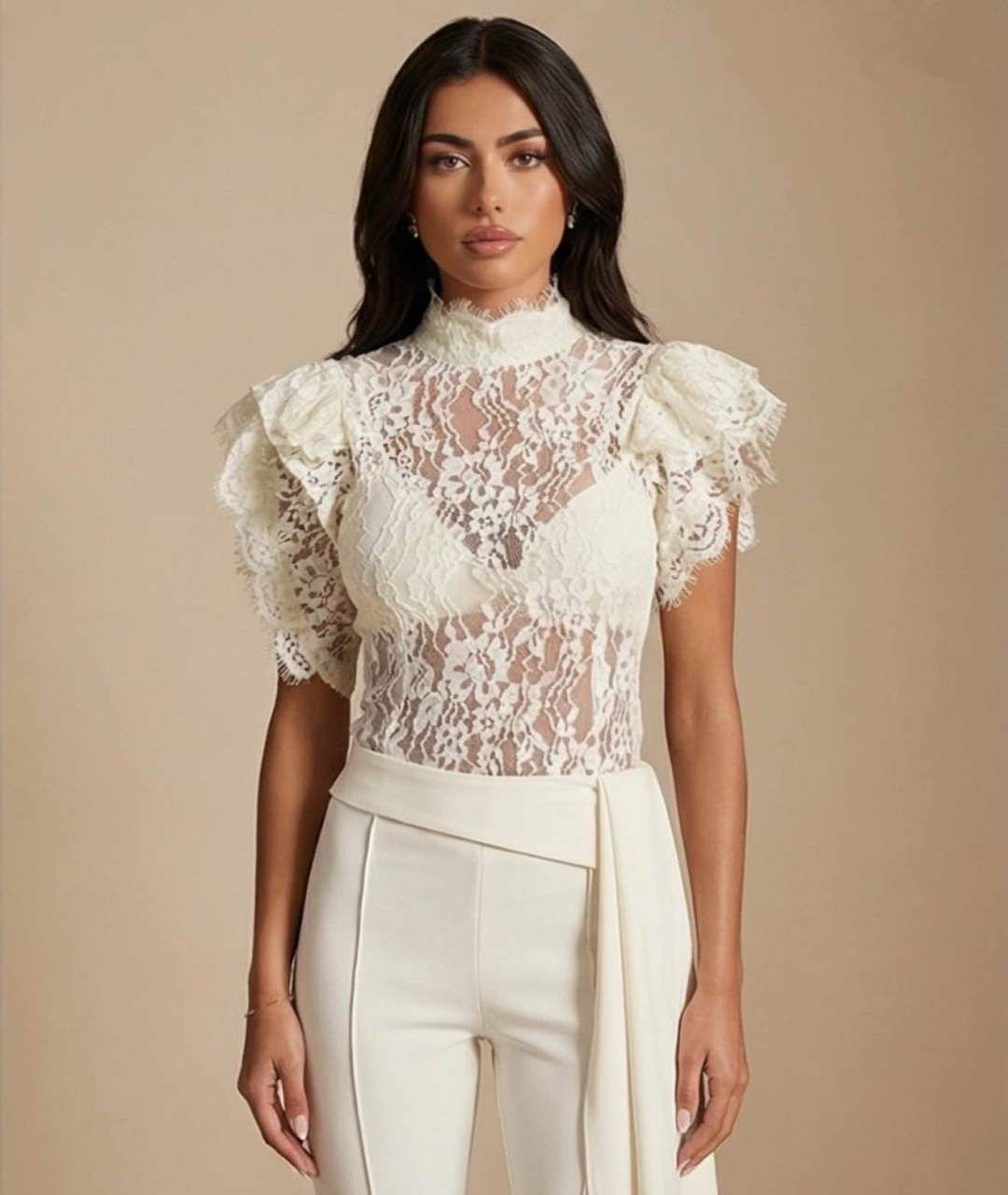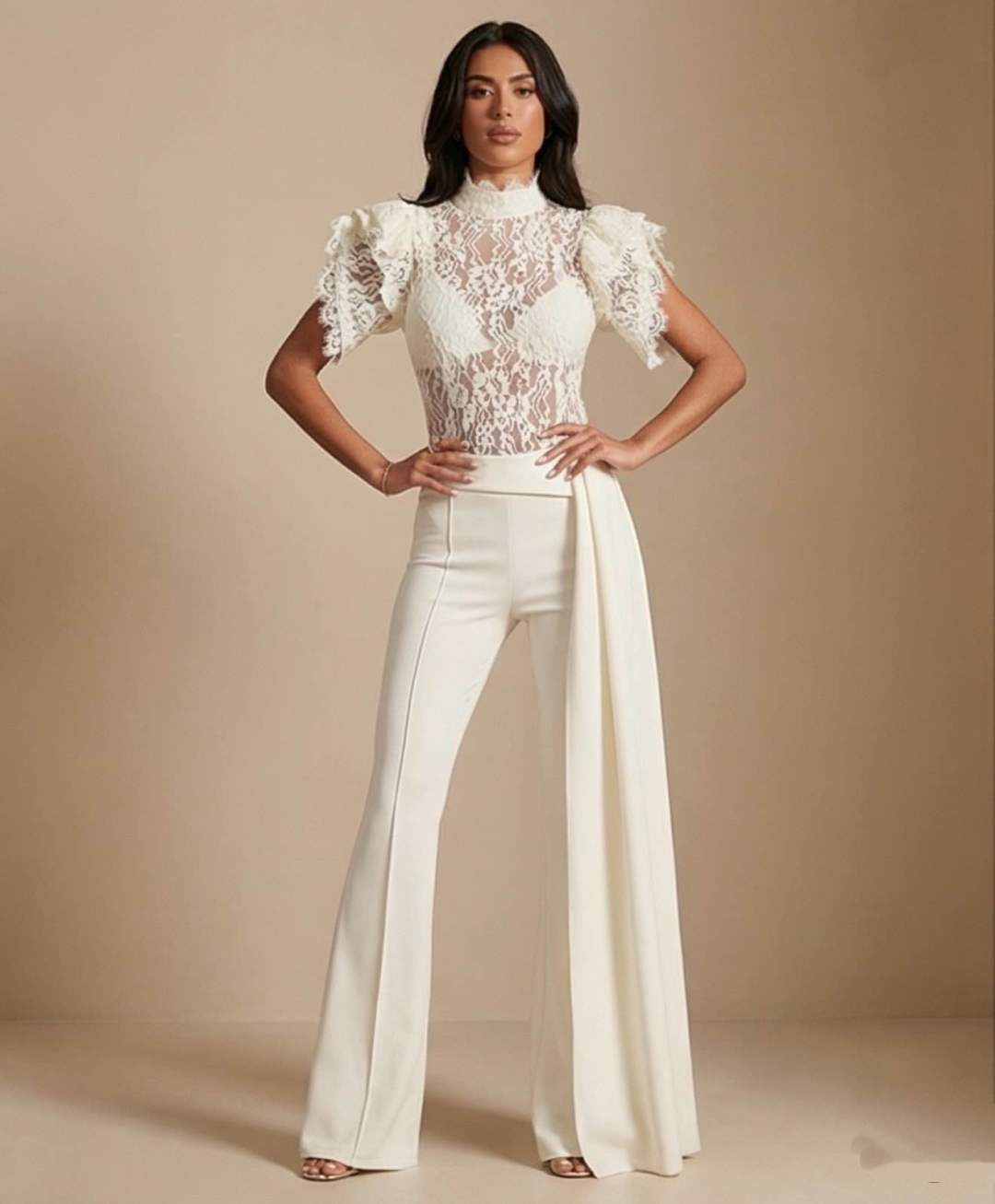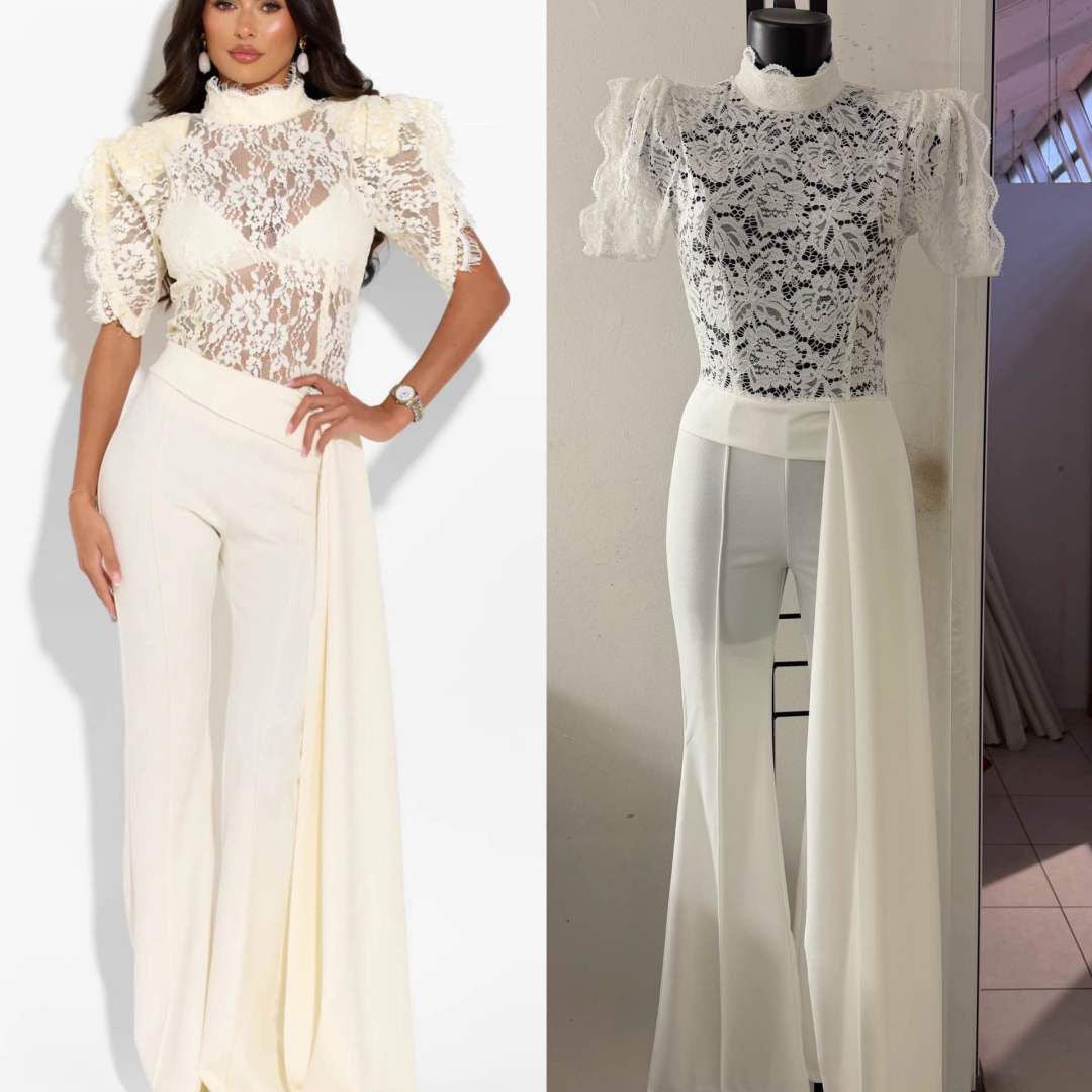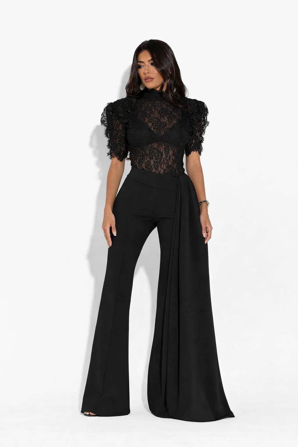 Tuta elegante  corpetto in pizzo trasparente a collo alto e maniche corte a volant. Pantaloni a vita alta, gamba ampia e dettaglio drappeggiato laterale. Raffinata e ideale per cerimonie o eventi.