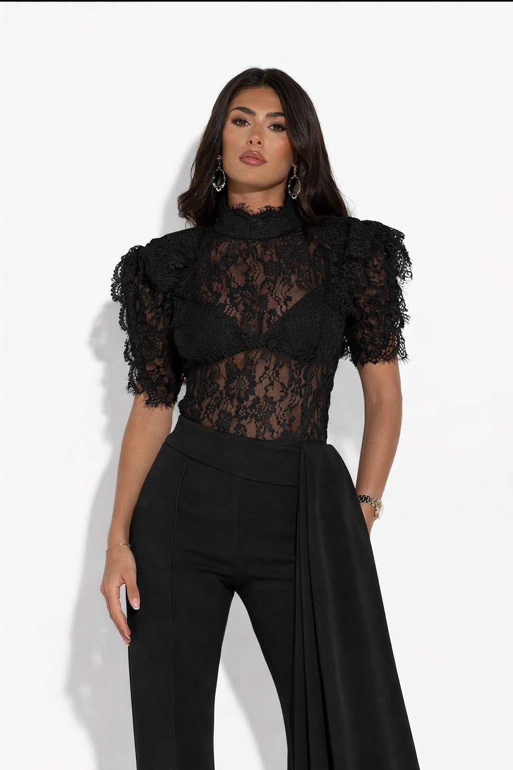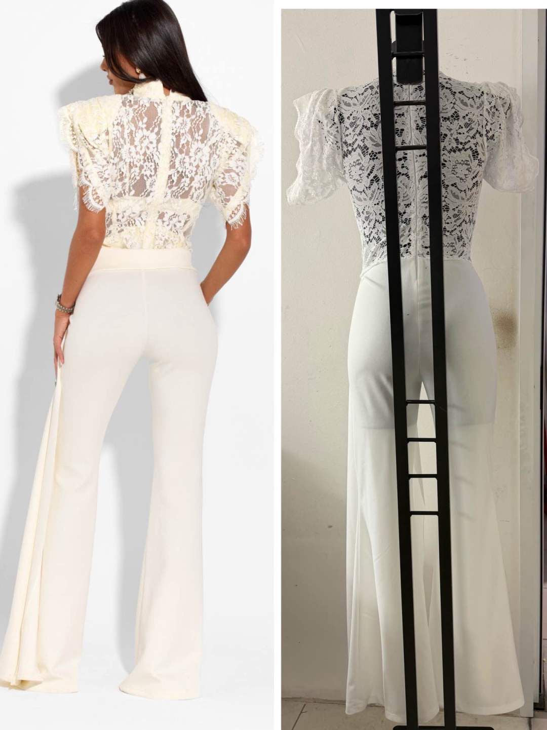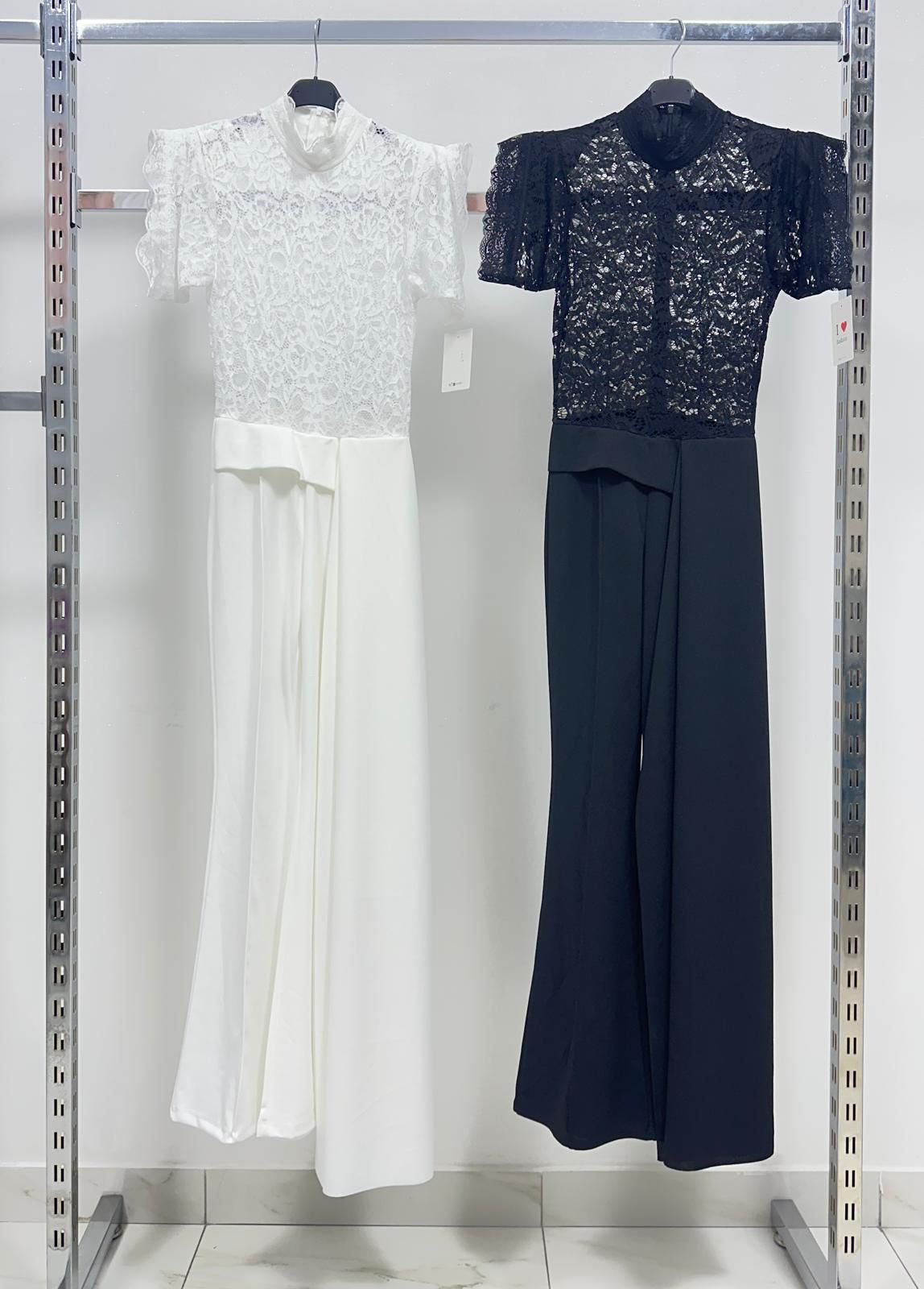 Tuta elegante  corpetto in pizzo trasparente a collo alto e maniche corte a volant. Pantaloni a vita alta, gamba ampia e dettaglio drappeggiato laterale. Raffinata e ideale per cerimonie o eventi.